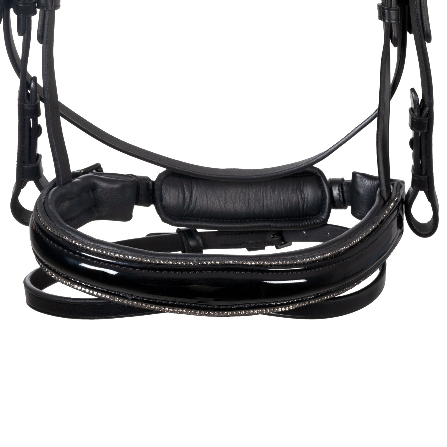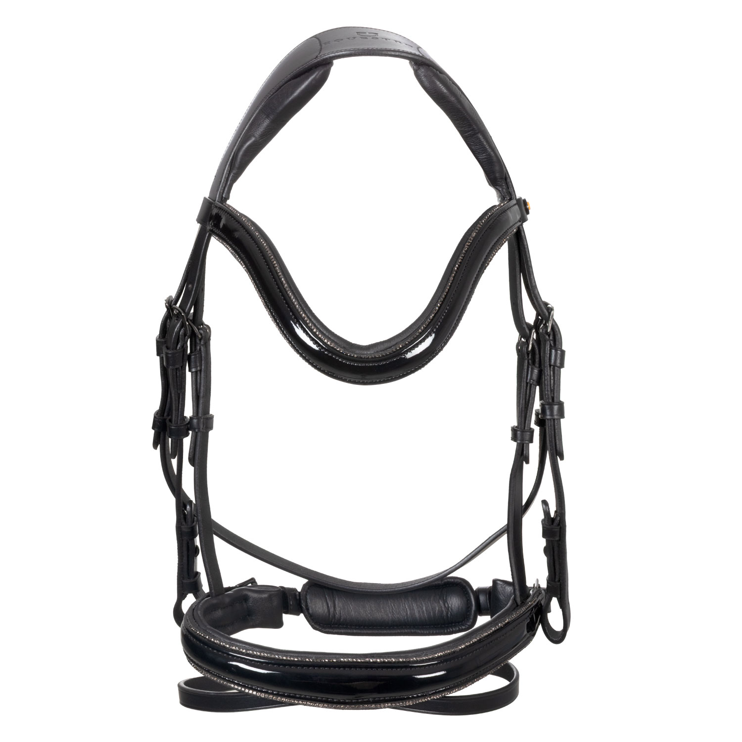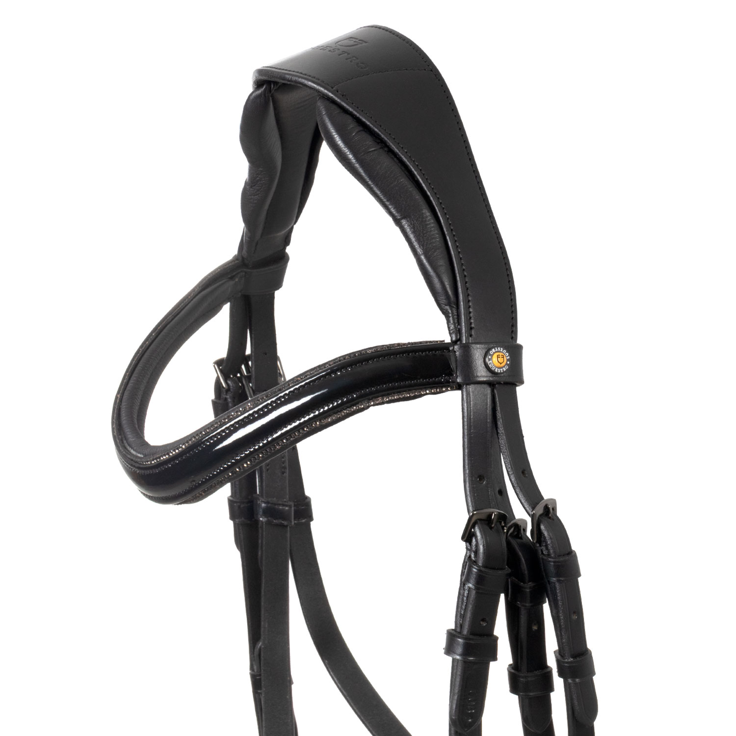 Obrvni trak je prav tako oblazinjen in okrašen s finimi vrstami okrasnih kamenčkov, enak detajl pa krasi tudi nosni trak iz poliranega usnja, kar uzdi daje eleganten in prefinjen videz. Logotip Equestro je diskretno prikazan na rumeni ploščici na koncu traku za obrvi.