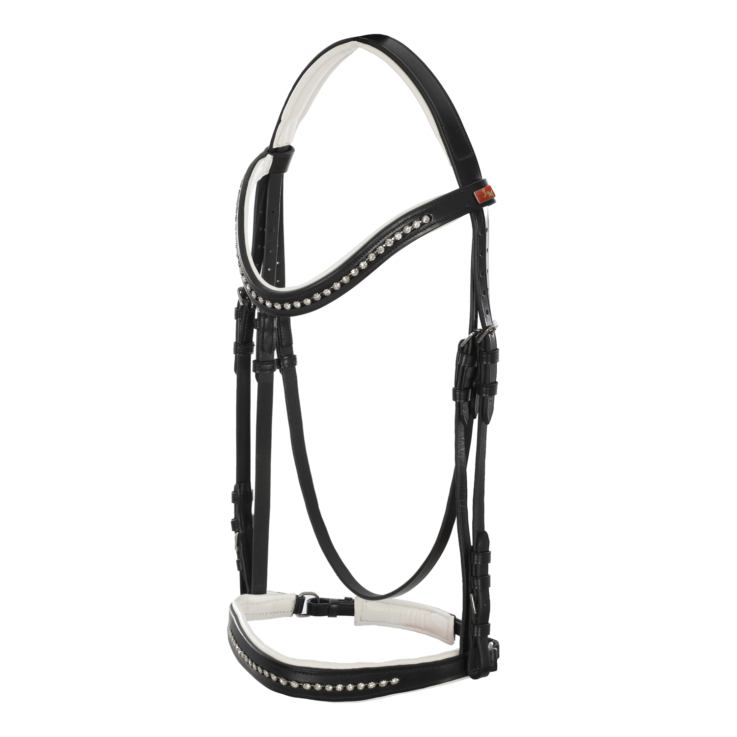 Dresurna uzda z bleščicami na nosu znamke JM je elegantna in funkcionalna uzda, zasnovana za dresurno jahanje, pri čemer združuje klasično obliko z modnim pridihom.