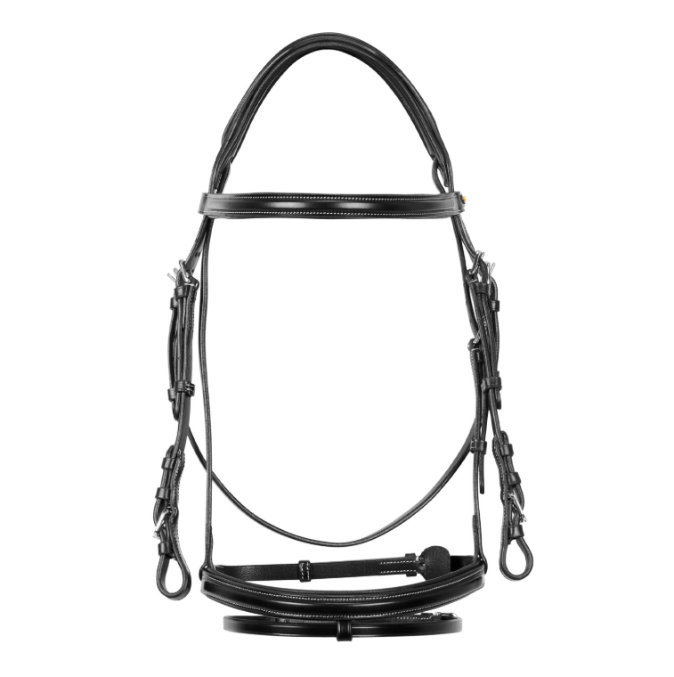 Nosni trak je podložen in nastavljiv, kar omogoča popolno prileganje in največje udobje, medtem ko je podložen trak za obrvi okrašen s kovinsko ploščico z logotipom Equestro, ki dodaja prefinjen in moderen videz. Uzda je robustnejša in bolj praktična, zasnovana tako, da zagotavlja večjo prilagodljivost pri skokih ter optimalno kontrolo.