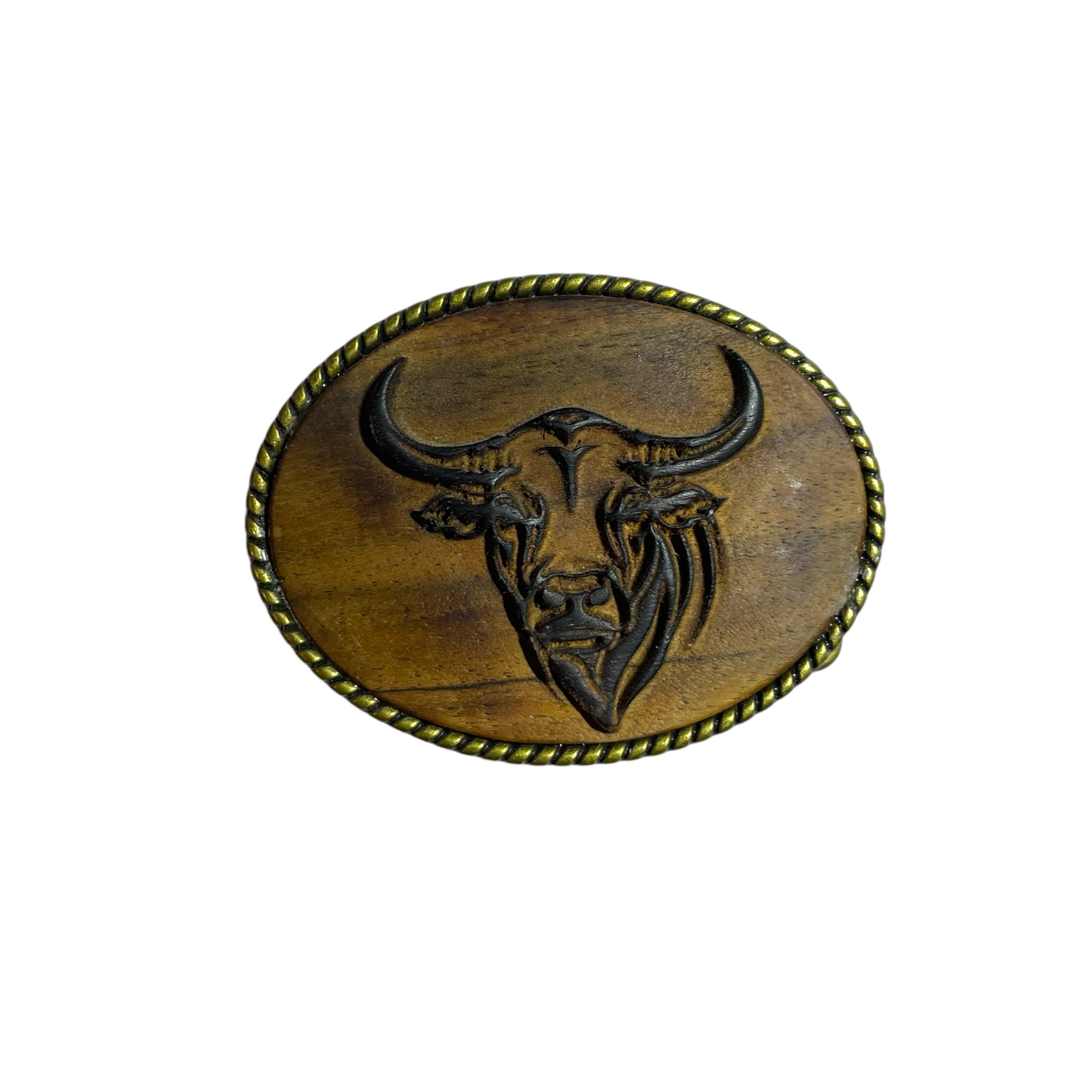 Lesena zaponka za pas z motivom bika – močan in naraven dodatek z izrazitim značajem.