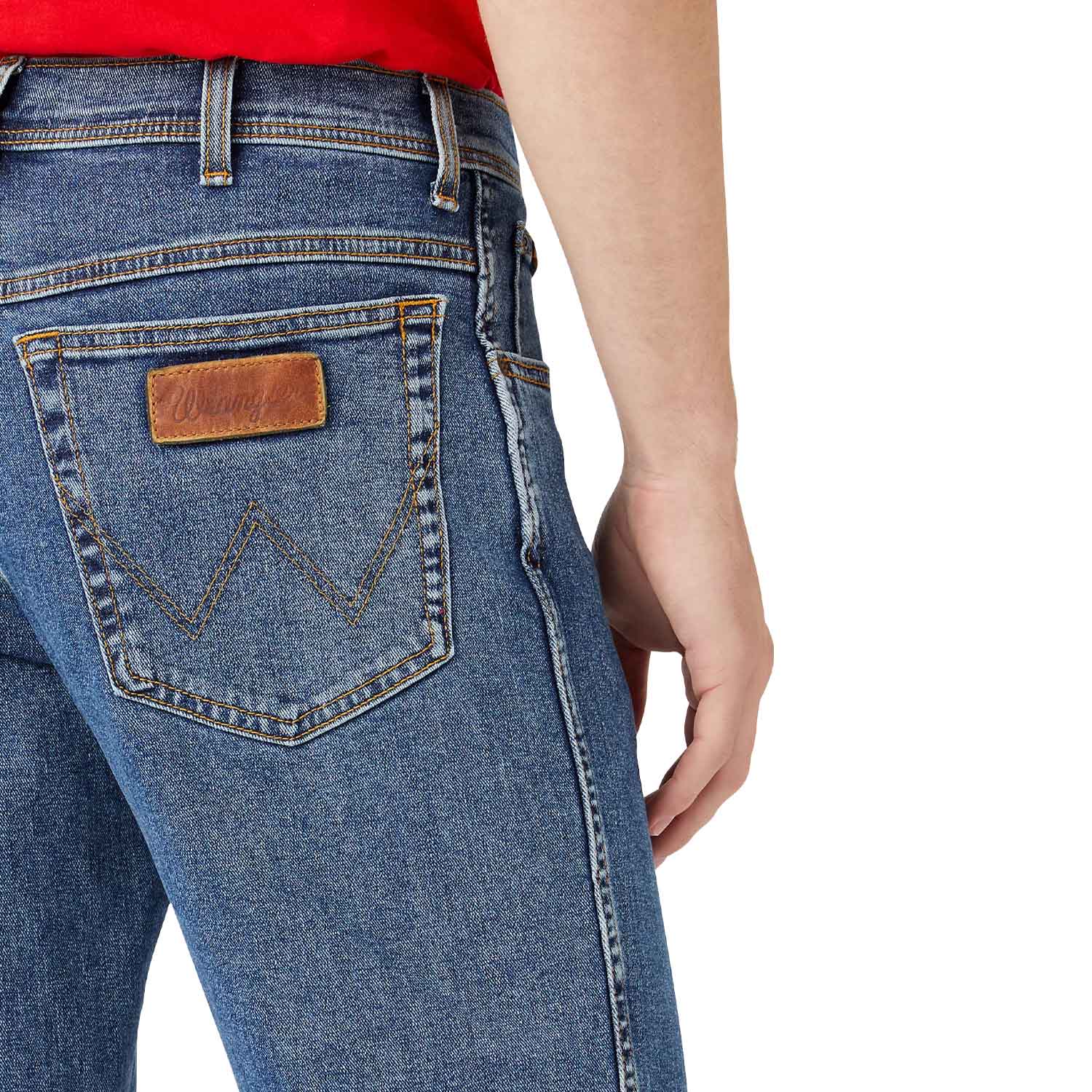 - Grafika z napisom Wrangler na usnjenem našitku v zadnjem žepu.