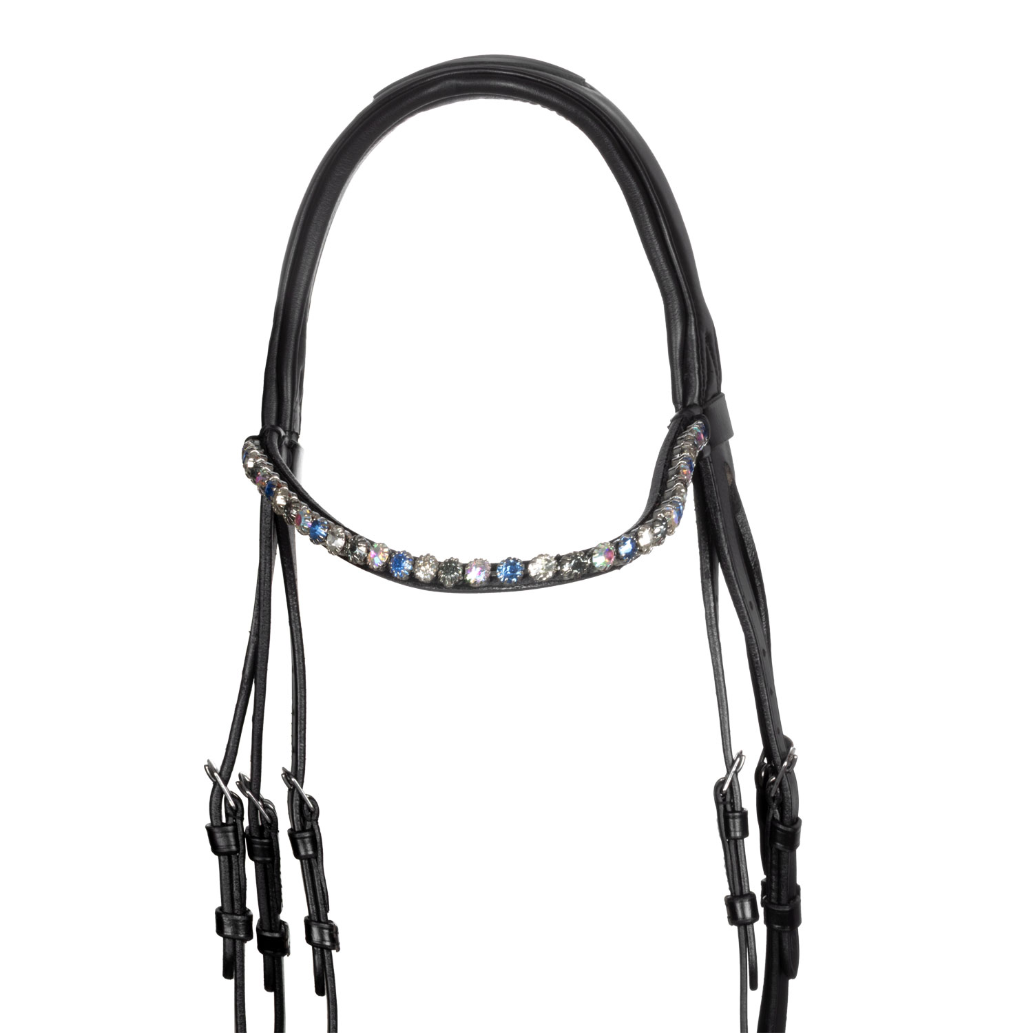 Anatomska in udobna uzda Acavallo® iz telečjega usnja z oblikovanim naglavnim delom, poliranim nosnim trakom in obrvni trakom iz kamenčkov.