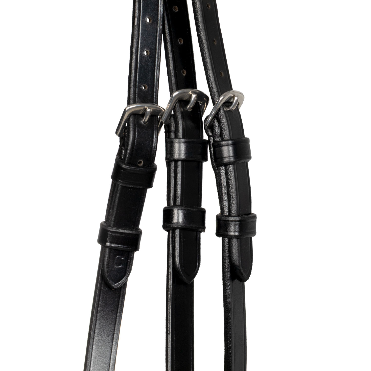 Uzda Moulin Rouge je izdelana iz vrhunske italijanske telečje kože, ki zagotavlja mehkobo, vzdržljivost in udobje tako za konja kot za jezdeca. Oblikovani, anatomski naglavni del enakomerno porazdeli pritisk, kar prispeva k večjemu udobju konja in bolj sproščenemu gibanju.