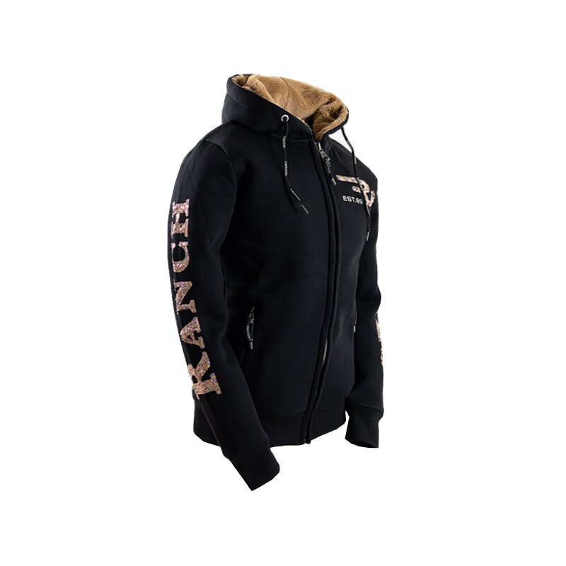 Izjemno prijetna in mehka OSWSA Ranchgirls hoodie jakna za ženske v črni barvi združuje toplino, udobje in glamur. Ta chic hooded jacket iz kolekcije Old Sorrel Western Sports Apparel navdušuje z elegantno kontrastno kombinacijo črne in rožnate barve, ki ji daje moderen in privlačen videz.