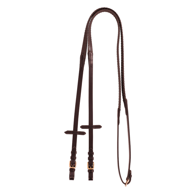 Vajeti za angleško uzdo, model Kris Rose Gold, izdelane iz visokokakovostnega italijanskega usnja, gume in zaponkami iz nerjavečega jekla za dodatno vzdržljivost.