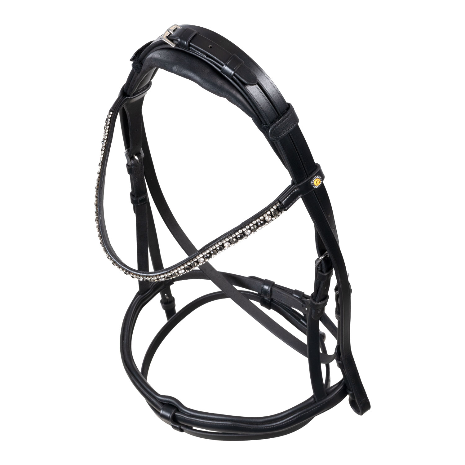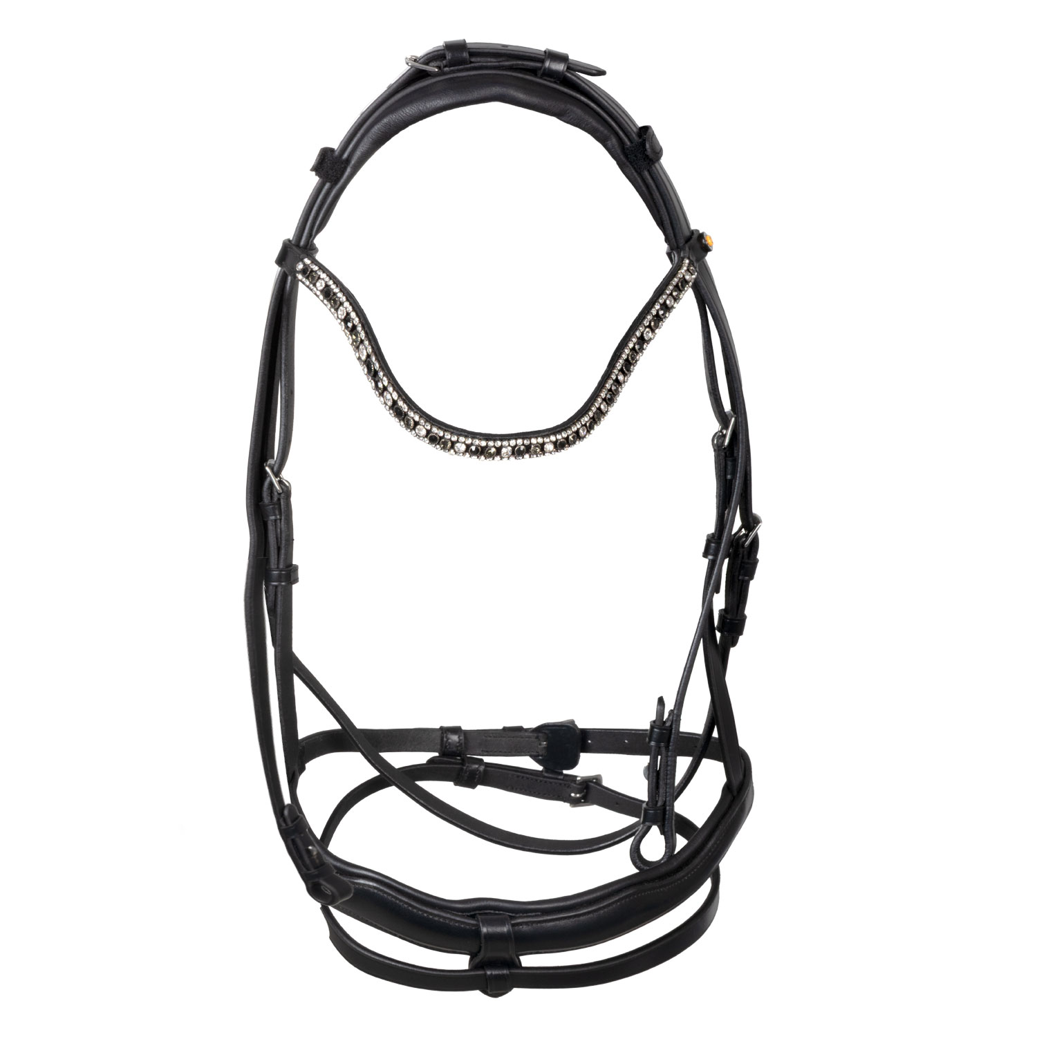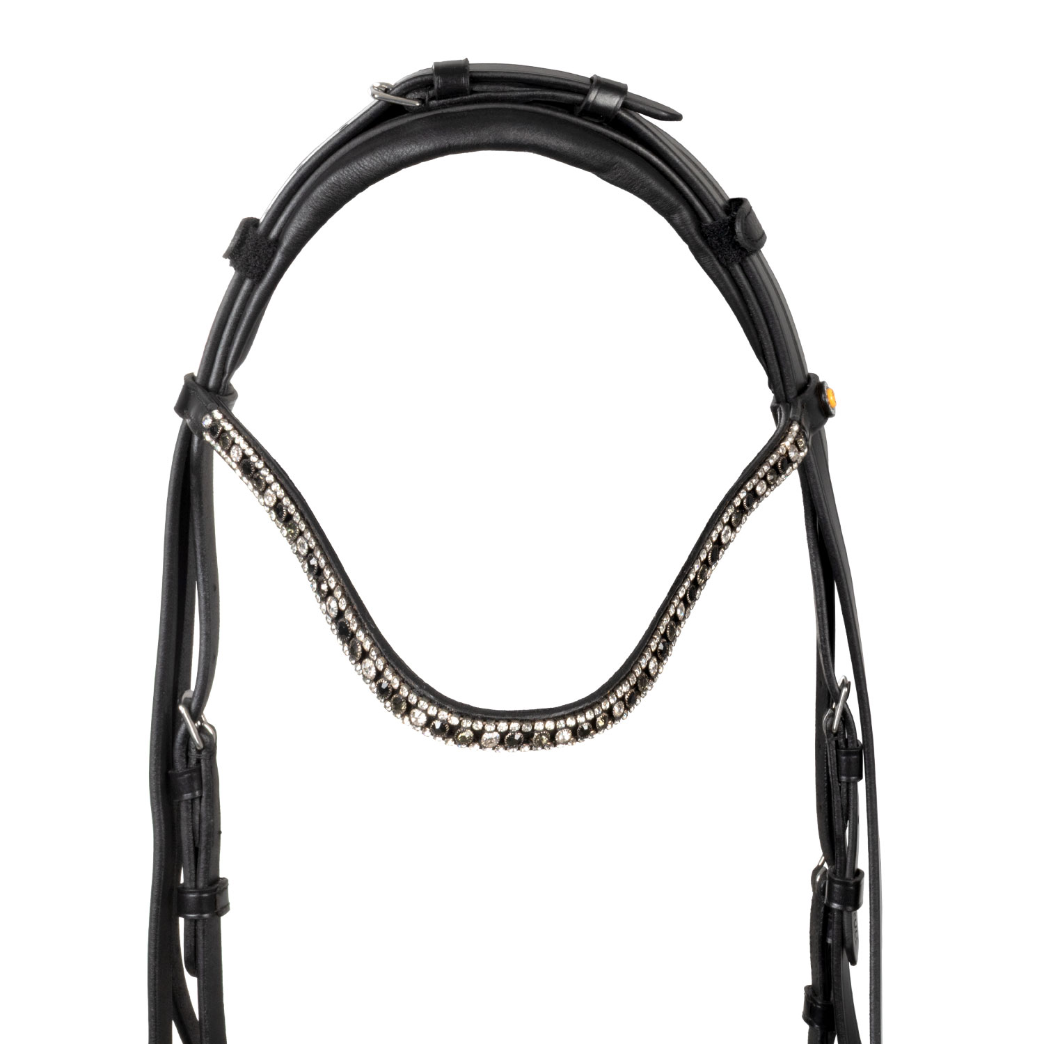 Sprednji del uzde je okrašen s kristalčki, ki dodajo prefinjen, moderen pridih, hkrati pa ne motijo udobja konja. Uzda je ergonomsko oblikovana, da se optimalno prilega glavi konja, zagotavlja stabilen nadzor in enostavno komunikacijo med jezdecem in konjem.