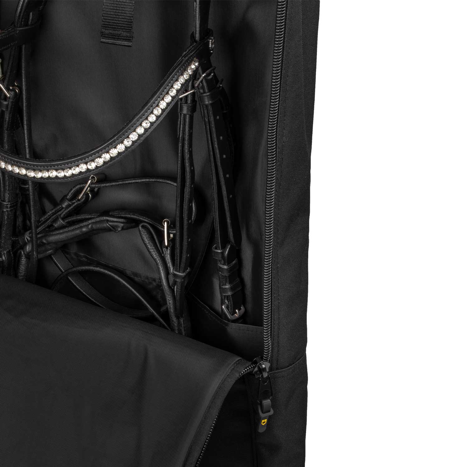 Torba za uzde z zapiranjem na sprednjo zadrgo in ergonomsko oblazinjenim ročajem: praktičnost in odpornost za varen in udoben transport uzd.