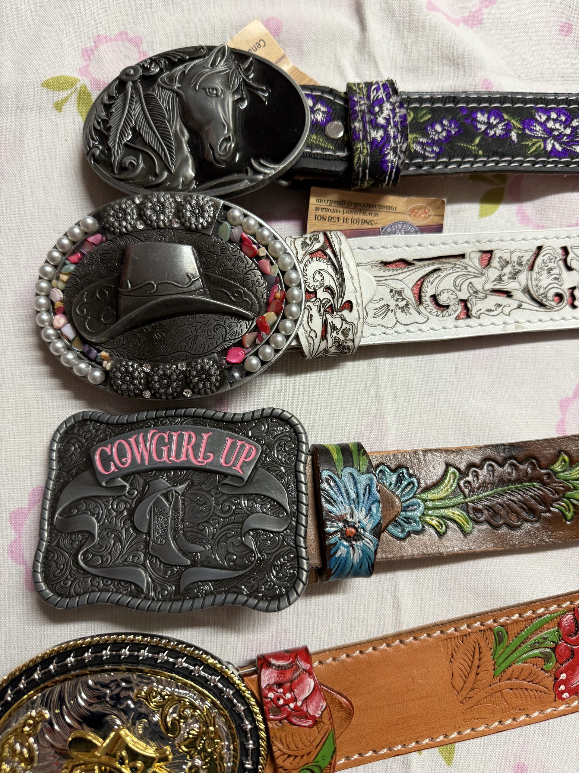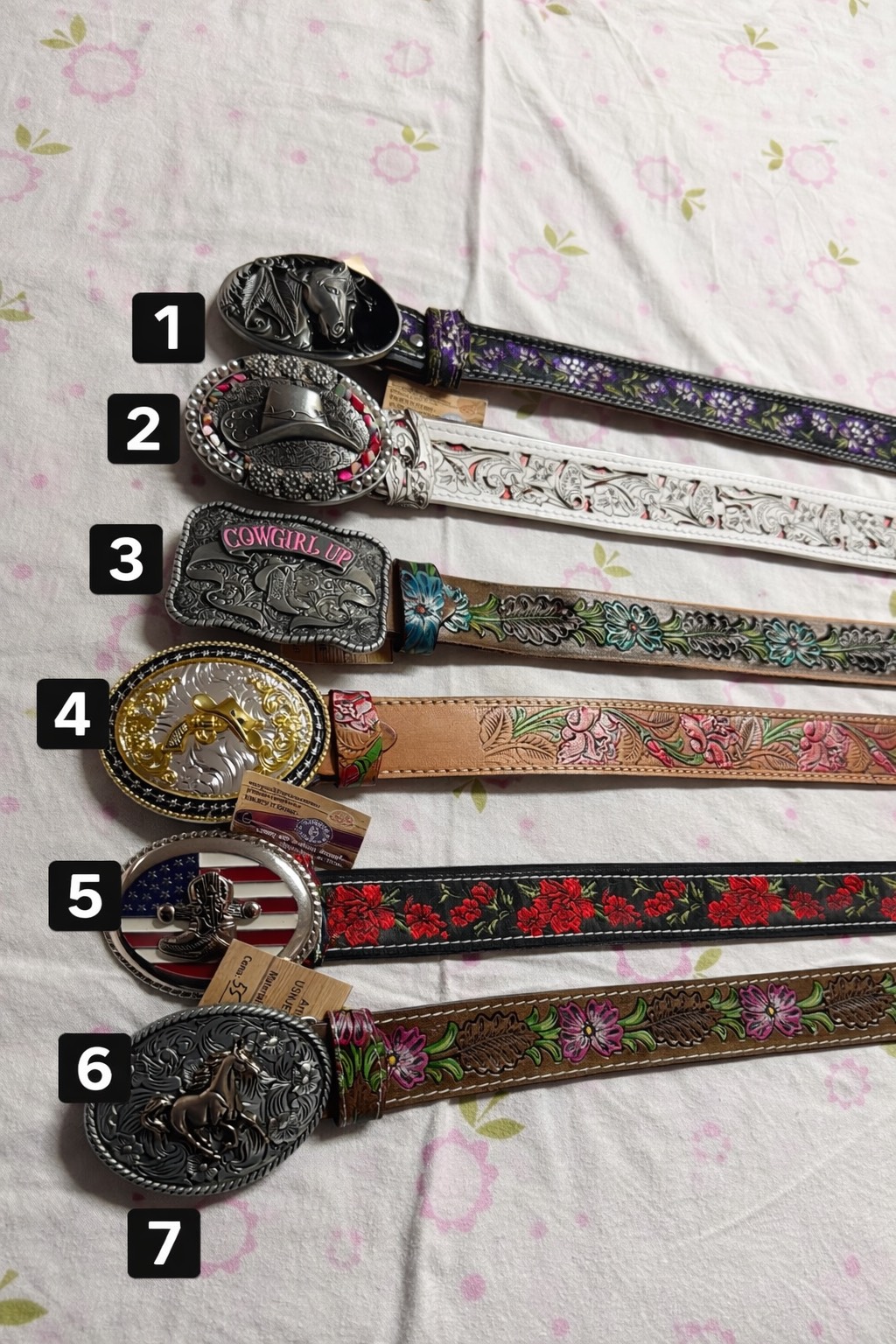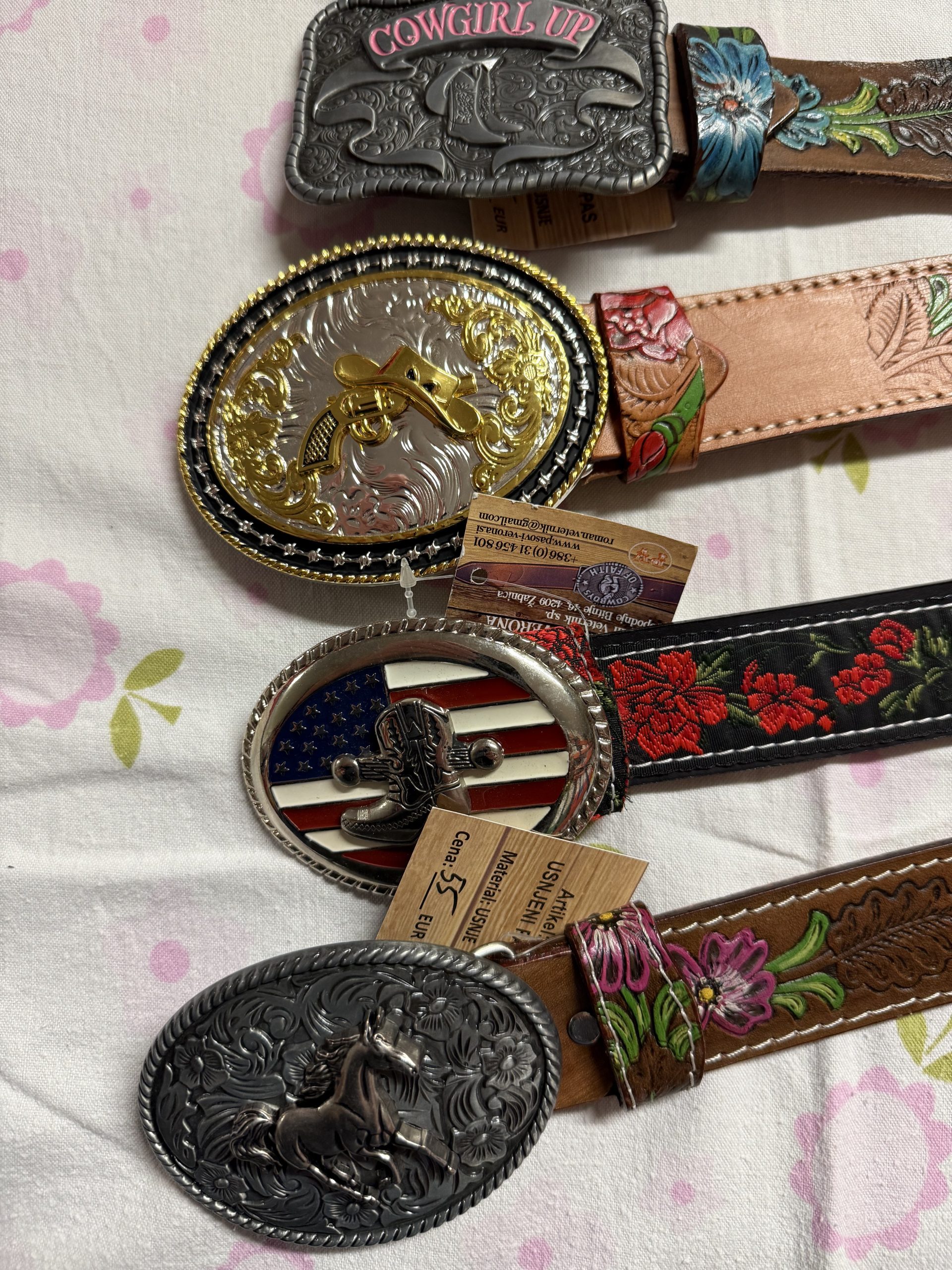 Vsak pas ima unikaten dizajn (različni cvetlični vzorci, motivi konjev, ameriški motivi ipd.) in je na voljo po številkah, kar omogoča enostavno izbiro.