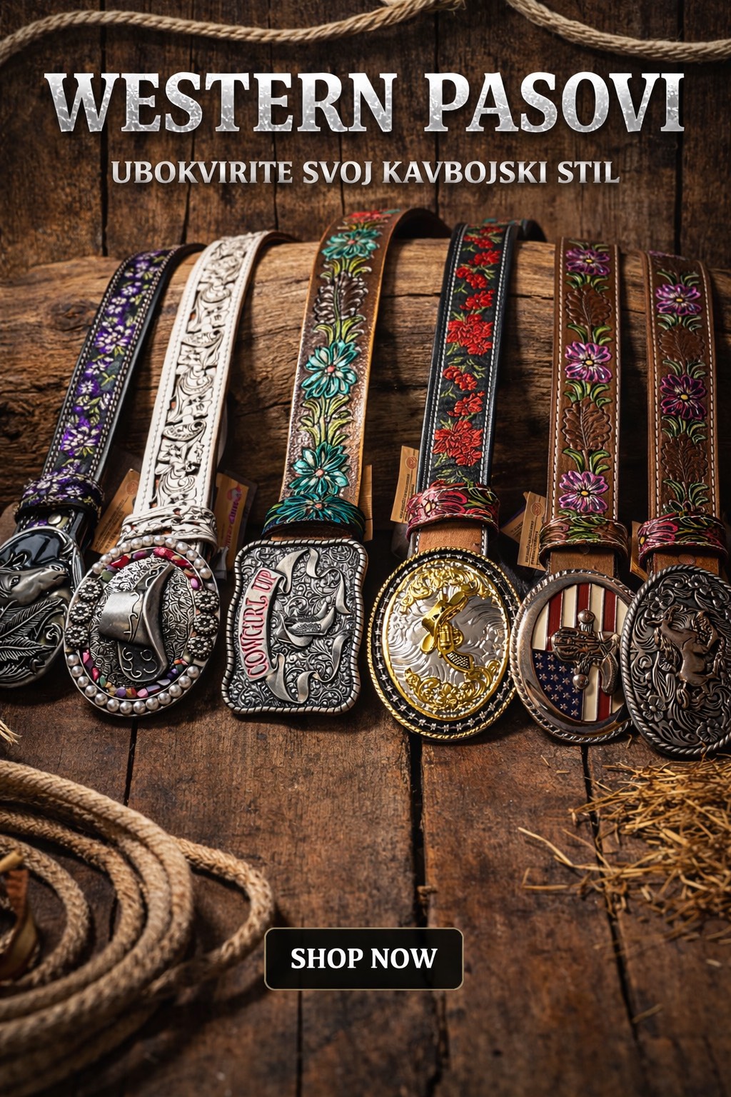 Kakovosten western pas iz pravega usnja, bogato okrašen z reliefnimi vzorci in masivno kovinsko zaponko v kavbojskem slogu. Pas je primeren za vsakodnevno nošenje ali kot izrazit modni dodatek za posebne priložnosti, country dogodke, rodeo, ples ali western stil.