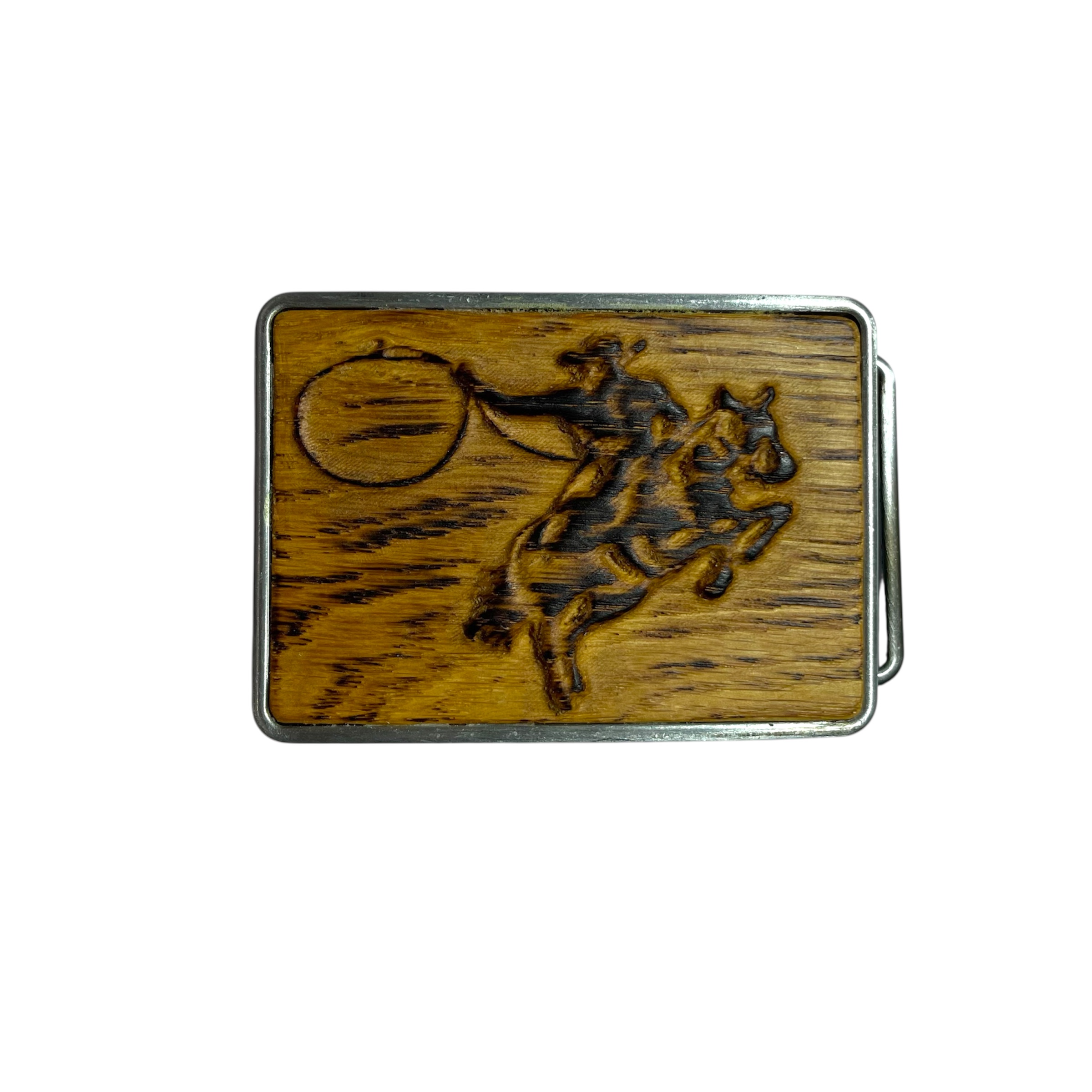 Elegantna zaponka za pas s kovinsko osnovo in vstavljenim lesenim elementom z izrezljanim motivom kavboja.